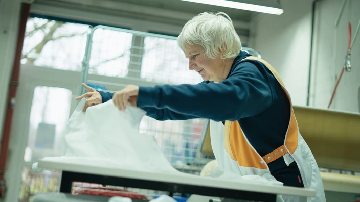 Falten und Verpacken von Kleidung und anderen Textilien nach der Reinigung.