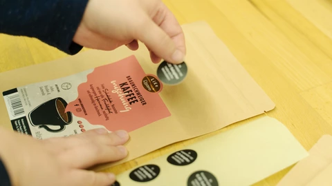 Nach dem Verpacken versiehst du die Pakete mit Etiketten. Darauf stehen wichtige Informationen wie der Kaffeetyp, das Röstdatum und das Herkunftsland der Bohnen.